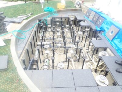 2,タイルをめくって噴水ノズルと照明器具の台座金物を設置
