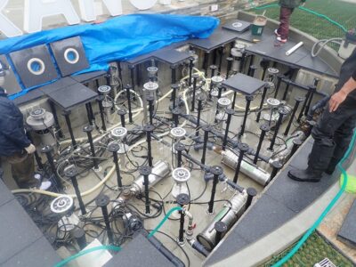 5m以上吹き上がる噴水を照射し染め上げる。夢の様なお仕事です。